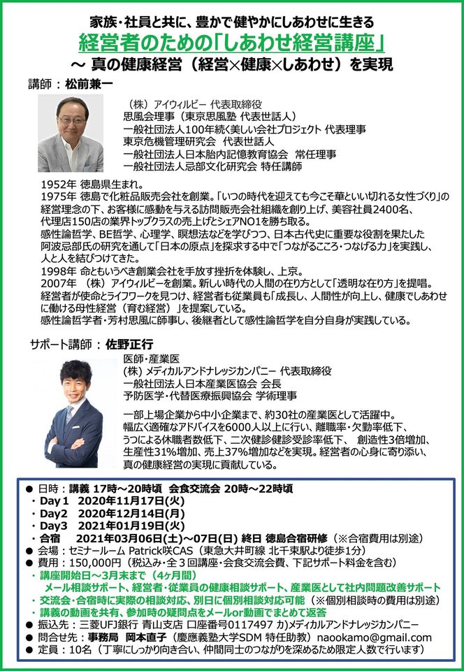しあわせ経営講座のご案内経営者が、家族・社員と共に、豊かで健やかにしあわせに生きる