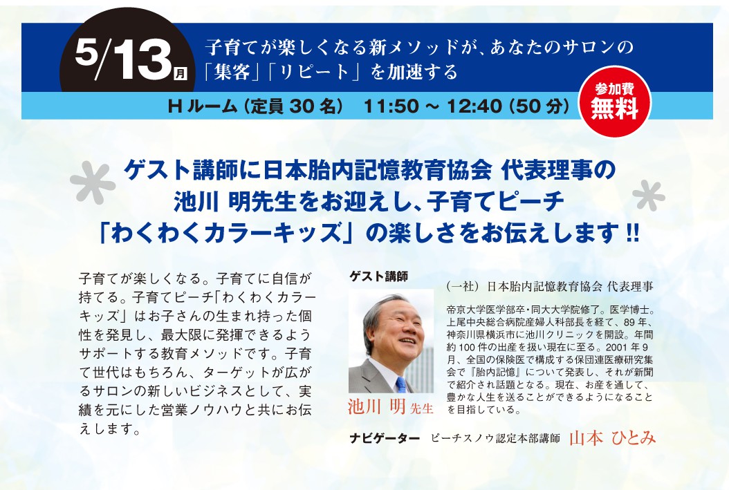 ビューティーワールド2019にて 池川先生講演 5/13開催のビューティーワールド2019池川先生の講演 子育てピーチ! 気になる。というか、受講して放置状態をちょっと勉強せねば [metaslider id=”32067″]