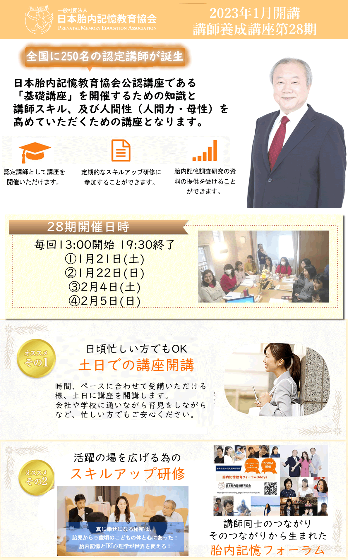 認定講師になった方には、これまで池川明が積み重ねてきた胎内記憶調査研究の資料の提供及び、(一社)日本胎内記憶教育協会公認講座である「基礎講座」を開講することが認められ、その後のフォローアップ研修やスキルアップ研修等に参加することができます。